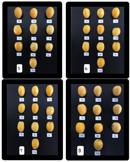 All of the treated and untreated fruits were allowed to aerobically dry; each treatment was split into two portions, I: to assess the physical features; II: to evaluate the chemical characteristics. Each portion had 3 replicates with the ratio (1.5 kg/replicate). Then, each duplicate was filled into punctured carton containers. All treated and untreated fruits were kept at 0 ± 2 °C and RH of 90–95%. The primary fruit quality features of date palm cv. Barhi after treating were determined (zero time). After 10 d intervals (i.e., at harvest, 10, 20, 30, 40, 50, 60, and 70 d), samples were taken from cold storage and fruit quality quantities were measured. Figure 3 depicts photos of Barhi date palm fruits were cold stored for 0, 10, 20, 30, 40, 50, 60, and 70 d after some pre-harvest treatments were applied via foliar spray.