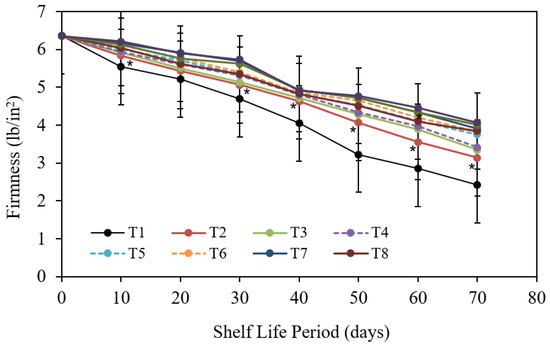 The impact of pre-harvest chitosan, chitosan nanoparticle and CaCl2 foliar spray treatments on firmness of Barhi date fruits under cold storing for 70 d. Note that * sign denotes the significant differences between the control and edible coatings treatments, and T1, T2, T3, T4, T5, T6, T7, T8, T9, and T10 are water (control), 1 g/L chitosan, 2 g/L chitosan, 3 g/L chitosan, 1 g/L chitosan nanoparticles, 2 g/L chitosan nanoparticles, 3 g/L chitosan nanoparticles treatments, respectively.