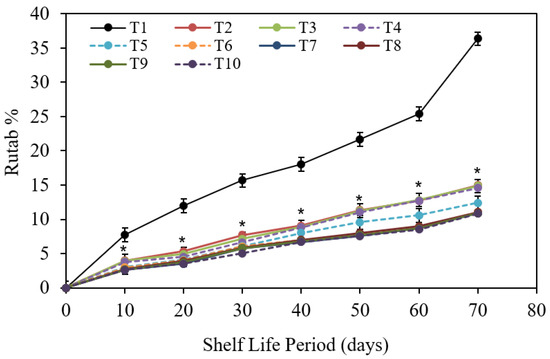 The impact of pre-harvest chitosan, chitosan nanoparticle, and CaCl2 foliar spray treatments on rutab proportion of Barhi date fruits under cold storage for 70 d. Note that * sign denotes the significant differences between the control and edible coatings treatments, and T1, T2, T3, T4, T5, T6, T7, T8, T9, and T10 are water (control), 1 g/L chitosan, 2 g/L chitosan, 3 g/L chitosan, 1 g/L chitosan nanoparticles, 2 g/L chitosan nanoparticles, 3 g/L chitosan nanoparticles treatments, respectively.