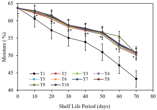 The impact of pre-harvest chitosan, chitosan nanoparticle, and CaCl2 foliar spray treatments on moisture of Barhi date fruits under cold storing for 70 d. Note that * sign denotes the significant differences between the control and edible coatings treatments, and T1, T2, T3, T4, T5, T6, T7, T8, T9, and T10 are water (control), 1 g/L chitosan, 2 g/L chitosan, 3 g/L chitosan, 1 g/L chitosan nanoparticles, 2 g/L chitosan nanoparticles, 3 g/L chitosan nanoparticles treatments, respectively.