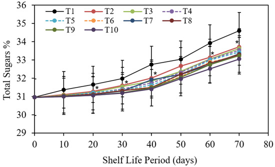 The impact of pre-harvest chitosan, chitosan nanoparticle, and CaCl2 foliar spray treatments on total sugars of Barhi date fruits under cold storing for 70 d. Note that * sign denotes the significant differences between the control and edible coatings treatments, and T1, T2, T3, T4, T5, T6, T7, T8, T9, and T10 are water (control), 1 g/L chitosan, 2 g/L chitosan, 3 g/L chitosan, 1 g/L chitosan nanoparticles, 2 g/L chitosan nanoparticles, 3 g/L chitosan nanoparticles treatments, respectively.