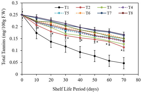 The impact of pre-harvest chitosan, chitosan nanoparticle and CaCl2 foliar spray treatments on total tannins of Barhi date fruits under cold storing for 70 d. Note that * sign denotes the significant differences between the control and edible coatings treatments, and T1, T2, T3, T4, T5, T6, T7, T8, T9, T10 are water (control), 1 g/L chitosan, 2 g/L chitosan, 3 g/L chitosan, 1 g/L chitosan nanoparticles, 2 g/L chitosan nanoparticles, and 3 g/L chitosan nanoparticles treatments, respectively.