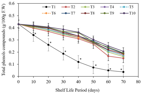 The impact of pre-harvest chitosan, chitosan nanoparticle, and CaCl2 foliar spray treatments on total phenols compounds of Barhi date fruits under cold storing for 70 d. Note that * sign denotes the significant differences between the control and edible coatings treatments, and T1, T2, T3, T4, T5, T6, T7, T8, T9, T10 are water (control), 1 g/L chitosan, 2 g/L chitosan, 3 g/L chitosan, 1 g/L chitosan nanoparticles, 2 g/L chitosan nanoparticles, and 3 g/L chitosan nanoparticles treatments, respectively.