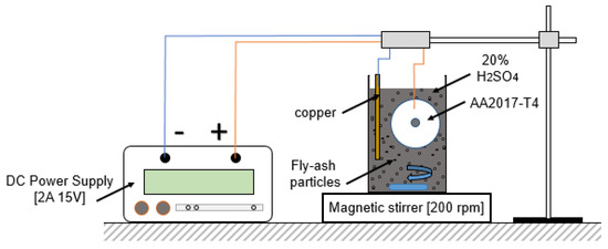 The hard anodizing was performed using a direct current (DC) power supply (TNI-UTM, Saharoongroj Co., Ltd., Bangkok, Thailand). As the electrolyte, 20 wt.% diluted sulphuric acid (H2SO4) was used; meanwhile, 30 mm × 60 mm copper plate was used as the cathode. The hard anodizing process was carried out at a constant current density of 15 A/dm2 and fluctuant voltage at ± 15 V. The initial temperature of the electrolyte was kept at the ambient condition (24 °C of temperature and 55% of relative humidity). A magnetic stirrer was used to maintain uniform ion concentration and reduce the localized heat build. Besides that, the electrolyte temperature changes were measured using an IR-750 infrared thermometer. The schematic diagram of the anodizing setup process is shown in Figure 3. The formation fabrication and analysis were divided into Phase 1 and Phase 2, as shown in Table 4. The fly-ash content was maximized to 50 g/L due to its natural behaviour, which compromised the viscosity and dispersion of the electrolyte. Lastly, anodized samples were dried in ambient conditions before being analysed.