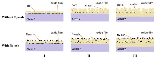 The growth mechanisms of the oxide film are illustrated in Figure 5. The presence of fly-ash during the anodizing process causes the entrapment of fly-ash inside the pores and crates. Under constant-current conditions, it was explained that the oxide growth rate is proportional to the applied current density and constant based on the ideal theory of Faraday’s law (as in Phase I) [30]. Despite the fact that, ideally, the potential should be increasing with the thickness of the growing barrier oxide, it is hard to be proven in reality. This is because the evolution of potential deviates as it increases with anodizing time. As the growth time increase, the escape of Al3+ from Al alloy creates more opportunities for oxide growth. The rapid formation of oxide layers creates un-uniformed pore formation due to the simultaneous migration of ions (escape of Al3+ and capture of OH−/O2−). Such rapid and spontaneous migration had created growth instabilities which caused entrapment of free O2− between the Aluminium oxides formed (Al2O3) (as shown in Phase II). These instabilities caused a slight increase in resistance which slightly lowered the voltage. The presence of fly-ash particles during the formation of the pores allowed the entrapment of small fly-ash particles inside the pores. In Phase III, the voltage was almost constant throughout the phase due to the saturation of fly-ash presence in oxide layers. The fly-ash started to agglomerate together and fill the pits and pores. Larger pores started to merge and form crates on the oxide film surface.