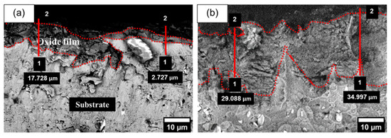 Cross-section of composite oxide coating for (a) 0 g/L and (b) 50 g/L.