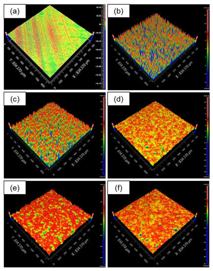 Figure 12 shows three-dimensional images of as-received Al alloy and composite oxide films reinforced with different fly-ash compositions at 60 min of anodizing time. The profile consists of crests and troughs, which are indicated based on different colour regions arranged from red, orange, yellow, green, to blue. The blue region was the lowest (trough), and the red region was the highest (crest). Figure 12a shows the as-received Al surface, while the anodized surfaces are shown in Figure 12b–f. Figure 12b shows the composite oxide surface for 1 g/L fly-ash, where many irregularities can be seen on the surface, indicating insufficient reinforcement to fill the pores and crates. With increasing fly-ash content, the pores were filled more. Starting at 30 g/L, the fly-ash reduced the number of pores and had smoother surfaces.