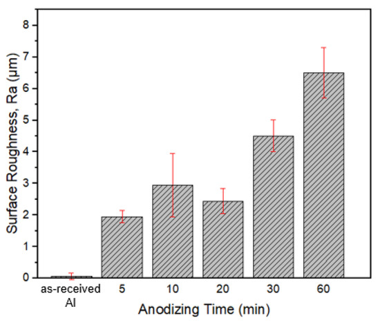 The surface roughness obtained from the morphological analysis is shown in Figure 9. Overall, the surface roughness of the composite oxide layer increased as the anodizing time increased. The surface roughness of the oxide coating at 60 min reached around ±6.5 µm. At 60 min of anodizing time, the pores formed on the surface started to grow larger, with the average width and the depth of pores being 45.5 and 15.0 µm, respectively. The highest width and depth of the pores for 60 min composite oxide surface were 80.2 and 30.1 µm, respectively. The dimension and number of pores in 60 min composite oxide film are reasonably most significant compared to the other surface, indicating that the anodizing time had played an essential role in impacting the pore dimension of the composite oxide film. The increment of the number of pores and nonuniform oxide film surface had gradually increased the surface roughness at 60 min. This was due to the region on the film surface between the smooth surface with pores and the graphite material as asperities. These findings correlate with previous research where 60 min of anodizing time was sufficient to form a fully covered and thick oxide film [3,16].