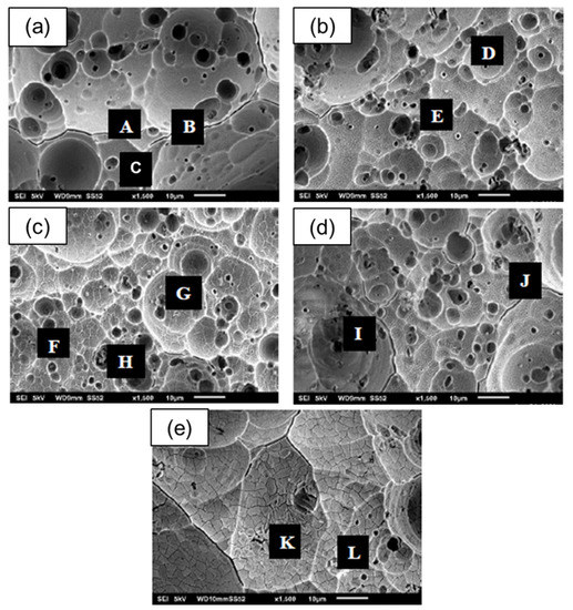 Figure 11 shows the cross section of the anodized Al alloy for 0 to 50 g/L fly-ash content. Point A shows no traces of Si element while point E shows traces of Si element. This indicates that the fly-ash had embedded into the oxide coating during the anodizing process. The coating thickness was estimated based on the colour contra and element analysis. It is observed that a significant thickness increases as the fly-ash content increases. The coating thickness for the 0 g/L surface (Figure 11a) was between 13–16 μm, whereas the thickness for the 50 g/L surface (Figure 11e) was roughly between 36–52 μm. The EDX analysis confirmed that the oxide formed at the subsurface label A (slightly bright) was an intermetallic compound with copper elements. In contrast, the region marked with label E was the fly-ash as the EDX analysis presented with silicon.