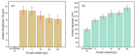 It was found that the surface roughness of oxide film without fly ash addition (0 g/L) was 10.1 μm; meanwhile, the surface roughness of composite oxide film with 50 g/L fly-ash decreased to 8.2 μm. It was believed that the fly-ash particles had filled the pores, hence reducing the depth of the pores and crates, making the surface smoother. Although there was a slight increase of surface roughness for 1 g/L fly-ash, the small amount of fly-ash added might not be adequate to fill the gaps as the fly-ash particles are randomly sized. It was believed that only a smaller fly-ash could fill the pores while the large-sized fly-ash remained on the solution. The surface roughness comparison obtained is shown in Figure 13a.