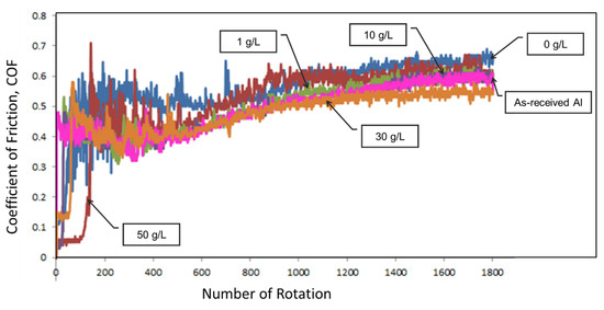 The composite oxide layer was then tested for the dry-sliding test using a ball-on-disc tribometer. The coefficient of friction (COF) taken was plotted against the number of rotations, as shown in Figure 14. The as-received Al and other oxide coatings were tested at an applied load of 1 N and speed of 30 rpm against a silicon nitride (Si3N4) ball with a diameter of 8 mm as the counterpart.