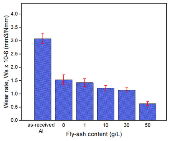 The wear rate of the as-received and composite oxide aluminium over different content of fly-ash particles is shown in Figure 15. It can be seen that wear rates of oxide films reinforced with fly-ash particles were much lower compared to the as-received and neat oxide films (0 g/L). The trend also shows that the wear rate decreased as the fly-ash content increased. By comparing the wear rate reduction, it can be seen that the presence of an oxide layer from anodizing process could reduce it up to 50.2%. With at least 1 g/L fly-ash added during the anodizing process, the wear rate had reduced almost 53.7%, with a 3.5% improvement compared to the neat oxide layer (0 g/L). The 50 g/L of fly-ash composite oxide surface present around 0.64 × 10−6 mm3/Nmm, which is a decrease of 79.3% compared with the as-received aluminium and 28.8% improvement from the neat oxide layer (0 g/L). These findings agree with earlier research, where the addition of reinforcement on oxide coating can increase hardness and thus reduce the wear rate [3].