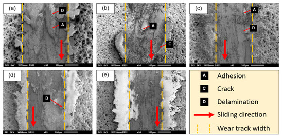 SEM analysis on wear track for (a) 0 g/L, (b) 1 g/L, (c) 10 g/L, (d) 30 g/L, and (e) 50 g/L of fly-ash.