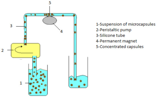 By using a peristaltic pump, the capsule suspension was circulated through a very thin tube into a recipient. The permanent magnet was placed under the tube at the middle distance between the pump and the recipient vial (Figure 1).