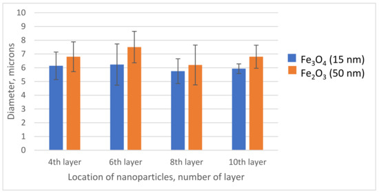 In the case of ferric oxide (Fe2O3, Ø 50 nm), a higher amount of iron was inserted in the capsules having iron oxide as the 4th and 6th layers, with a decrease in the amount of iron as the nanoparticles form the 8th and 10th layers, respectively. Thus, greater accumulation is observed when nanoparticles are placed on 4th and 6th layers as compared to 8th and 10th layers, regardless of the transportation fluid used.