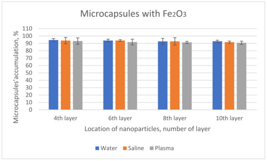The accumulation of capsules was quite high, exceeding 90% (Figure 4). There was a slight decrease in the accumulation of microcapsules containing ferric oxide as the nanoparticles were placed closer to the outer layer.