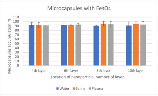 Microcapsules containing magnetite also accumulated in a high amount (Figure 5). In water, the trend was similar to the other type of microcapsules; there was a slight decrease in the percentage of accumulation as the nanoparticles were placed closer to the outer layer. However, in saline and plasma, they tended to agglomerate as the nanoparticles were placed closer to the outer layer. Thus, the location of nanoparticles (close to the surface or, on the contrary, close to the core) exerts some influence.