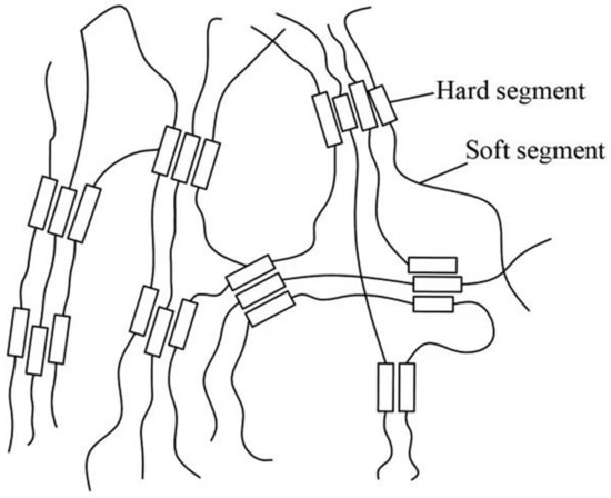 The macromolecular structure of PU resins contains a large number of repeating carbamate chains that are formed by the reaction of polyisocyanates with polyols, including oligomers containing hydroxyl groups. PU is a block polymer with a molecular structure consisting of hard and soft segments. The soft segment of the molecular structure is formed by the polymerization of high molecular weight polyols with polyisocyanates, while the hard segment is formed by the polymerization of small molecular weight diols (chain extenders) with polyisocyanates [31]. The structure of the hard and soft segments of PU is shown in Figure 6. The properties of PU materials depend to a large extent on the phase structure of the hard and soft segments and the degree of microphase separation. A moderate degree of phase separation is beneficial to improve the properties of the polymer. From the viewpoint of microstructure, in PU materials, carbamate groups with strong polarity and rigidity can form hydrogen bonds between molecules due to their large cohesion energy and gather together to form hard segment microphase regions. At room temperature, these microregions exhibit glassy subcrystalline or microcrystalline forms. Polyether or polyester segments with weak polarity are clustered together to form soft segment phase regions [32]. Although there is some miscibility between the soft and hard segments, the hard and soft segments are thermodynamically incompatible. In this case, microphase separation occurs, and the soft and hard microzones exhibit their respective glass transition temperatures. The soft phase region mainly affects the elasticity and low temperature properties of the material. The chain segment attraction between the hard segments is much greater than that between the soft segments. The hard phase does not dissolve in the soft phase, but is distributed in it, forming a discontinuous microphase structure. At room temperature, it acts as a physical cross-linking point for the soft segments and acts as a reinforcement. Therefore, the hard segment has an important influence on the mechanical properties of the material, especially tensile strength, hardness, and tear resistance. This is why PU elastomers exhibit high strength and elasticity at room temperature, even without chemical cross-linking. The mechanical properties of PU elastomers are directly influenced by the degree of microphase separation and the uniformity of the distribution of the hard phase in the soft phase.