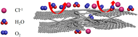 In addition, graphene and its derivatives in the coating can also act to prevent metal corrosion reactions. The high electrical conductivity of graphene materials can transfer the electrons lost from metallic materials to the surface of the coating, and by forming a passivation film on the surface of the base material, the corrosion rate can be effectively reduced. It also absorbs the corrosive medium Cl− to avoid corrosion caused by its contact with metal surfaces and provides effective electrochemical protection for the substrate material [28,29].