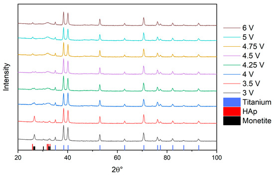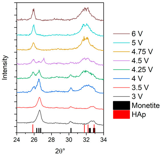 3.1. X-ray Diffraction (XRD) Determination of the Phase Composition of Electrochemically Deposited Calcium Phosphates