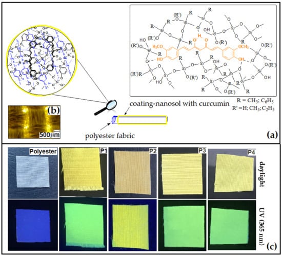 In order to follow the adaptability process of film-forming materials containing the chromophore to the textile support, we synthesized four types of nanocomposites in which the silica network modifiers were varied. Curcumin was entrapped in the host silica matrices modified with aliphatic or aromatic residues. Following the process of impregnation with nanosol solutions, four types of uniformly coated polyester specimens were obtained (Figure 2a,b) having fluorescent properties (Figure 2c). The influence of the coatings’ properties and interactions with the polyester support, related to the structure of nanocomposites, were also studied.