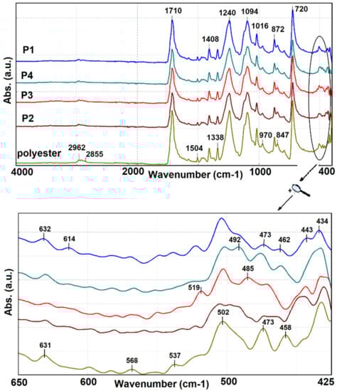 The four types of nanocomposite coated polyester materials were characterized by FTIR-ATR spectra to highlight the structural changes that occurred after the nanosol deposition onto the surface of the support (Figure 3).