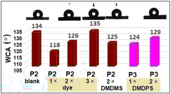It is observed that the presence of the voluminous groups introduced by PTES in the silica matrix led to π–π type stacking of the benzene rings, obtaining more thick coatings with a high peak around Rmax = 102.4 nm (Figure 5c). At the same time, a reduction in the surface roughness of P4 compared to P1 is obtained, as it can be seen in Table 1. The interactions established between benzene rings from different molecules of precursors decisively determined a significant improvement in the hydrophobic properties of the coating, characterized by a WCA of 120° (Table 1). In the case of P2-type sol–gel coatings without dye (P2 blank), a very high value of 134 (±5.13°) of WCA was recorded (Figure 6). This value does not change at high concentrations of the dye in the nanosol (135 ± 5.39°), but decreases significantly at low dye loadings (118 ± 8.1°). The change in the contact angle with the variation in the dye concentration can be explained by the hydrophobic nature of the dye, which leads to segregation processes in the silica matrix. At the same time, the structures of nanosols are also influenced by the processes of aggregation of dye molecules, at high loadings. While the concentration decreases, the dye is dispersed in the siloxane matrix and is willing to establish intermolecular bonds with the host matrix. By varying the ratio of alkyl and aryl residues in the siloxane matrix, it can be seen that the changes in the WCA of the coatings are not so dramatic, varying only by 5 to 7°.