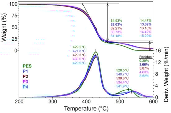 Thermogravimetric analysis was performed with a TGA Q5000IR (TA Instruments, New Castle, DE, USA) instrument. The 3–5 mg samples were analyzed in platinum pans under the following conditions: ramp 10 °C/min to 700 °C, synthetic air 5.0 (99.999%) used as purge gas at a flow rate of 50 mL/min.
