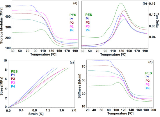 The storage modulus is an indication referring to the ability of the samples to store deformation energy in an elastic manner and is closely related to the degree of crosslinking. In our study, at room temperature, the highest value of the storage modulus was recorded for P1 due to the formation of hydrogen bonds between hydroxyl groups generated by the homo-polymerization of epoxy groups and carbonyl groups belonging to the PES support. From the higher values obtained in the case of P3 or P2 compared to those obtained in the case of P4 (Figure 8a), it can be noticed that a higher degree of crosslinking of the hybrid coatings generated from trialkoxysilanes enhanced the storage modulus, while dialkoxysilane precursors, which generate linear siloxanes, lead to a more flexible coating. However, the π–π interactions, with the support, increased the storage relative to the support itself.