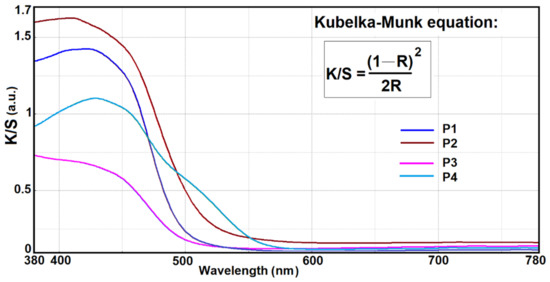 The influence of the host matrix in which the dye is embedded on the optical properties of the coated fabrics were evaluated using Kubelka Munk equation (Figure 9). Considering that the dye concentration is constant and the textile support on which the hybrid materials were deposited was the same, it is observed that the light absorption and scattering processes are influenced by the structure of the siloxane network and, as a consequence, by the intermolecular interactions established between the dye, as a visiting molecule, and the hosting network. Thus, the predominant intermolecular hydrogen bonds in P1 lead to a decrease in the K/S value, compared to P2, where the organic network modifiers have lower potential to establish intermolecular hydrogen bonds with the chromophore. At the same time, the presence of phenyl groups in the siloxane network directly influenced the absorption coefficient of the dye. Their presence leads to a hydrophobic environment in the network that favors the aggregation processes due to π–π interactions between phenyl residues belonging to the dye and to the hybrid network. In this case, it can be observed that there is an increase in the ratio of phenyl groups in the P3 coating, which results in a drastic decrease in the K/S coefficient, compared to the P4 nanocomposite.