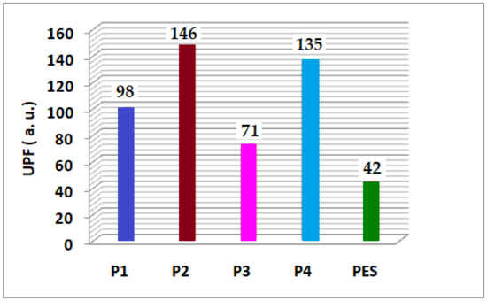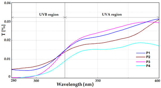 From the shape of the transmittance spectra, it can be intuited that the coatings have anti-UV properties. This subheading (forecast) is supported by the very low transmittance T < 0.02% in the UVB range (290–320 nm), whose values in the UVA region (Figure 11) reach around 0.03%. Thus, following the calculations in which the values of the transmitters in the range 290–400 nm are involved, according to EN 13758-1, these results confirm that all the coated polyester textiles have the ultraviolet protection factor +50 (Figure 13).