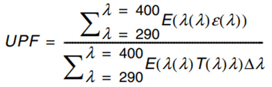 Equation for the calculation of the ultraviolet protection factor (UPF), where E(λ) is the solar spectral irradiance; ε(λ) is the relative erythema effectiveness; T(λ) is the spectral transmittance at wavelength; and Δλ is the wavelength interval of the measurements.