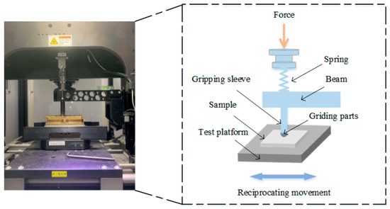 An RTEC friction and wear tester (MFT-50, San Jose, CA, USA) was used to analyze the friction and wear characteristics of the laser-cleaned samples. The principle of the friction and wear experiment is shown in Figure 2. The friction method was the dry reciprocating friction of the ball and the plate. A GCr15 steel ball-bearing (Ra < 0.1 μm) with a diameter of 6.35 mm and a hardness of 750 HV was selected as the counter-grinding ball. The load force of the wear test was 10 N, the wear time was 30 min, the displacement amplitude was 4.5 mm, and the working frequency was 2 Hz. After the friction and wear experiment was completed, a white light interferometer (MFT-4000, Lanzhou Huahui Instrument Technology Co., Ltd., Lanzhou, China) was used to collect the wear scar morphology of the sample and measure the friction coefficient.