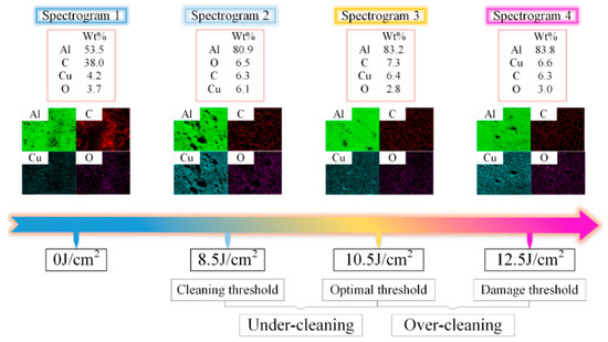 Figure 4 is a flow chart of the entire cleaning process, combining the surface topography and flow chart to analyze the cleaning process further. When the aluminum alloy surface was not cleaned, the aluminum element content was 53.5%, the carbon element content was 38.0%, and the oxygen element content was 3.7%. At this time, the surface contained a greater number of impurities. When the energy density reached 8.5 J/cm2, the aluminum element content increased to 80.9%, the carbon element dropped to 6.3%, and the oxygen element rose to 6.5%. At this time, most of the impurities on the surface of the aluminum alloy were removed, but there were a greater number of oxides around the ring structure on the surface, causing the oxygen content to rise. At this time, it was in a state of under-cleaning. When the energy density reached 10.5 J/cm2, the range of the aluminum was further increased to 83.2%, and the oxygen content dropped to the lowest point of 2.8%. At this time, the annular structure on the surface of the aluminum alloy disappeared, and the cover was the smoothest, indicating the most effective cleaning state. When the energy density was increased to 12.5 J/cm2, there was no noticeable change in the elements on the surface, and the oxygen content was slightly increased. At this time, the surface of the aluminum alloy was thermally oxidized around the crater due to the action of the laser spot, causing the oxygen content to increase again, which was a state of over-cleaning.