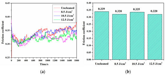 Figure 5 shows the wear scar morphology of each sample under different energy densities. Figure 6 shows the friction coefficient of each sample under different energy densities. From Figure 5 and Figure 6, we observed that the wear scar depth of each sample was 120, 111, 86, and 130 μm when the energy density was 0, 8.5, 10.5, and 12.5 J/cm2, respectively. The average friction coefficient of each sample was 0.3388, 0.3201, 0.3349, and 0.3197, respectively. Impurities and oxides adhered to the surface of the sample when it was not cleaned, and the surface was rough, so the depth of the wear scar and the average friction coefficient were both at a maximum. When the energy density was 8.5 J/cm2, the impurities and oxides on the sample’s surface were removed. The ring structure on the surface increased the friction resistance, resulting in a slight decrease in the friction coefficient and a decrease in the depth of the wear scar. The abrasion resistance of the aluminum alloy surface was improved. When the energy density reached 10.5 J/cm2, the surface of the aluminum alloy was the smoothest, there were the fewest oxides, and the cleaning effect was the most noticeable. At this time, the average wear scar of the sample is the shallowest, and the friction coefficient is slightly higher than that of the energy density of 8.5 J/cm2, which may be caused by the decrease of the surface hardness of the substrate. When the energy density reached 12.5 J/cm2, the wear scar depth of the sample increased, whereas the average friction coefficient decreased. The aluminum alloy underwent thermal oxidation, and there was a new oxide film on the surface. The low adhesion of the film led to an increase in the depth of the wear scar [21]. The decrease in the average friction coefficient was due to the increase in hardness, which is explained in the subsequent experimental discussion. In summary, laser cleaning could improve the wear resistance of the aluminum alloy surface, and the effect was greatest at 12.5 J/cm2.