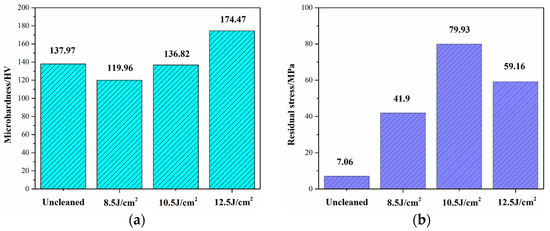 Changes in the surface microstructure of metal materials will affect their mechanical properties, so we studied the effect of laser cleaning on the surface microhardness and residual stress of the aluminum alloy. Figure 7a shows the microhardness value of each sample under different energy densities, and Figure 7b shows the residual stress value of each piece under different energy densities. As shown in Figure 7a, the microhardness value of the aluminum alloy surface was 137.97 HV without cleaning. When the laser energy density was 8.5, 10.5, and 12.5 J/cm2, the microhardness of the surface was 119.96, 136.82, and 174.47 HV, respectively. When the energy density was 8.5 and 10.5 J/cm2, the surface hardness of the aluminum alloy was lower than that without cleaning. When the energy density reached 12.5 J/cm2 (over-cleaning), the surface hardness significantly increased. Figure 8 is a diagram of the principal hardness strengthening of the aluminum alloy surface after laser cleaning. When the laser spot acted on the aluminum alloy surface, pits were formed on the surface due to the impact effect of the pulsed laser. Affected by the impact pressure, the insides of the holes were microstrengthened. In an under-cleaned state, the surface of the aluminum alloy was mainly ring-shaped, with a slight decrease in hardness. When a state of excessive cleaning was reached, many pits were formed on the surface of the aluminum alloy. The uniform distribution of the holes included a layer of strengthened film on the character of the sample, which significantly increased the hardness.