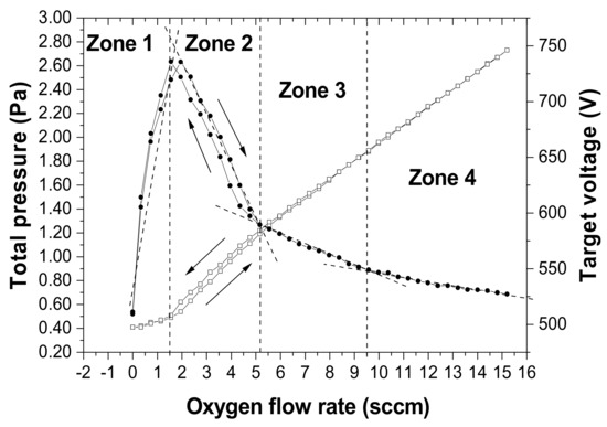 Hysteresis curves reflecting the total pressure (□) and target voltage (●) evolution as a function of O2 flow rate when Q (O2) increased and then decreased. The absolute errors on total pressure and target voltage were ± 0.01 Pa and ± 4 V, respectively.