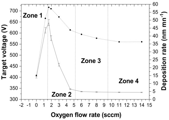 Based on the different trends observed on the W target voltage during the study of the W–Ar–O2 system hysteresis (Figure 1), the chemical composition and the optical and electrical properties, we classified the WOx film formation process into four zones, in contrast to the literature, which proposes three zones [10,12,13]. The W–Ar–O2 system hysteresis was not studied by the authors who suggested three zones for the WOx formation process. However, in agreement with these authors, we determined the same extreme zones: namely, Zone 1 and Zone 4 in our study. The WOx deposition rate evolution in this study was also similar to that in the study of Yamamoto et al. [10].