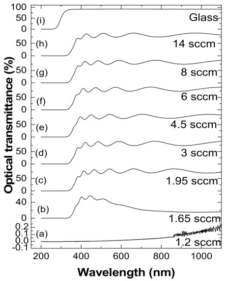 The optical transmittance as a function of the wavelength of different WOx thin films from Zones 1 to 4 is shown in Figure 4 for various oxygen flow rates between 1.2 and 14 sccm. For comparison, glass optical transmittance was also measured (Figure 4i). It was close to 92% in the visible region and its absorption threshold was approximately 260 nm, corresponding to a gap of about 4.8 eV.