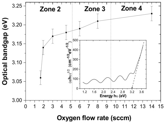According to Figure 5, the optical band gap increased from Zones 2 to 4. In fact, the band gap of the WOx films deposited between Q (O2) = 1.65 sccm and Q (O2) = 14 sccm evolved from 3.06 to 3.23 eV, respectively. We can assume that our deposited films were amorphous because these values are consistent with amorphous coating structures [33,34]. In comparison, the optical band gaps of nanocrystallized WO3 films that are reported in the literature are generally between 2.6 and 3 eV [29,35,36].
