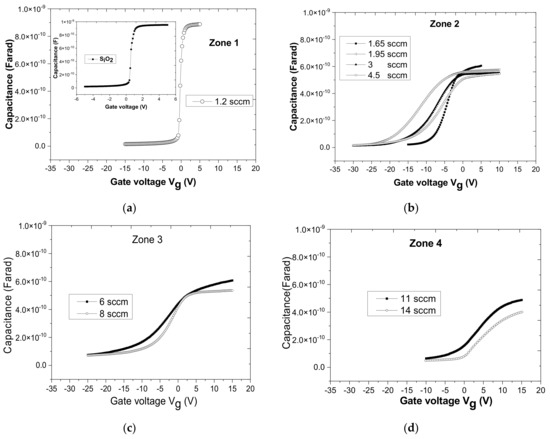 A drop in the oxide capacitance (Cox) was observed as we evolved from Zone 1 (900 pF) to Zone 4 (400 pF) (Figure 6a–d). This could be related to the resistive nature of the WOx films deposited with a higher oxygen flow rate [44] and also linked to the covalent strengthening of W-O bonds when Q (O2) increases. In Figure 6a–d, it is also important to note the different gate voltage ranges for the different zones. The choice of the gate voltage interval had to be imperatively adapted to each oxide and beyond this interval, the WOx films could become damaged.