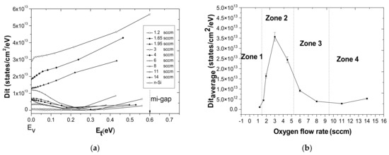 (a) The influence of oxygen flow rate on Dit evolution as a function of the energy variation in the Si band gap. The relative errors on Dit were evaluated as ± 8%. (b) The evolution of Dit-average as a function of the oxygen flow rate.
