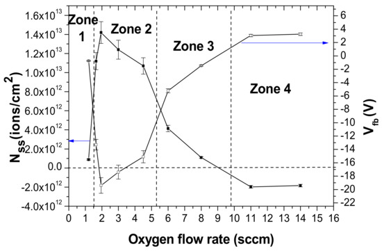 Figure 8 shows the negative values of Nss and the positive values of Vfb for both films deposited with Q (O2) = 11 sccm and Q (O2) = 14 sccm (Zone 4). The values of Nss and Vfb, which were almost constant, meant that negative charges were predominant in these films [49]. All oxygen vacancies seemed to be fulfilled by oxygen, so we could assume that we could no longer find positive charges in these films. Indeed, when all oxygen vacancies in the WO6 octahedra or WO3 were fulfilled, the excess oxygen flow rate could generate O2− ions, which could be placed into interstitial sites between the WO6 octahedra in the WO3 films. In this situation, the Nss corresponded to negative species with W6+ valence states in the octahedra. In Zone 4, the films were stoichiometric or over-stoichiometric, according to results of the atomic O–W ratio (Figure 3).