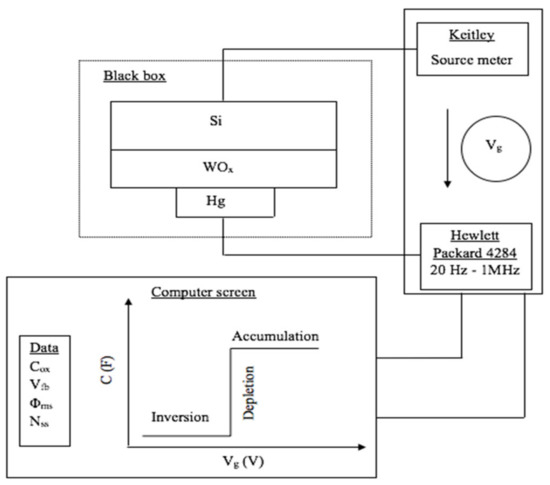 The device was made from a black box or chamber, a Keithley generator coupled with a Hewlett Packard 4284 A C-V data recorder, a mercury probe controller (model 802) to maintain Hg-WOx contact and a computer. The MOS structure (Hg-WOx-Si) was placed into the box, which was kept close during the C-V measurements in order to avoid the influence of solar electromagnetic radiation. The Keithley generator (Keithley) varied the voltage across the MOS structure while the Hewlett Packard 4284 A measured the capacitance. This voltage, called the gate voltage, is the superposition of a high-frequency alternative signal (AC) (1 MHz in our study) and a continuous signal (DC). The Keithley generator and the LCR meter 4284 A (Hewlett Packard) were connected to a computer fitted with an MDC Advanced Semiconductor Analysis Program to display the measurement results and provide instructions to the device, respectively.