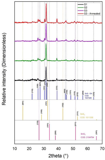 Figure 1 shows the XRD pattern of the samples, which agrees with the typically reported structure of the orthorhombic SnS phase (reference COD #96-152-7226). Here, we could not notice any peak related to the trigonal SnS2 secondary phase (reference COD # 96-703-8081), except in sample S1, where a low-intensity peak in the (001) direction is observed [10,32]. In the figure, it can be seen that as the deposition time and the concentration of the Sn precursor increased, the peaks corresponding to the orthorhombic SnS phase were further accentuated. These effects, produced by the change of the growth conditions, could be indicating an improvement in the crystalline quality of the sample.