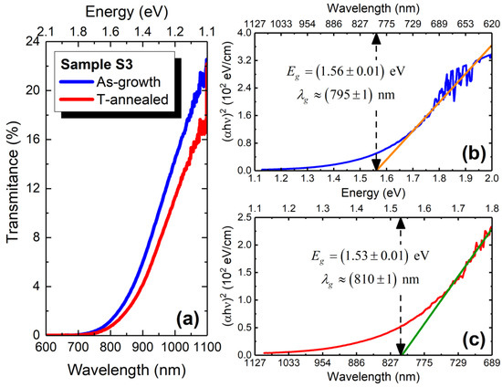(a) Transmittance spectrum of sample S3 before and after the thermal annealing. (b) Fitted Tauc plot of sample S3 before and (c) after the thermal annealing.