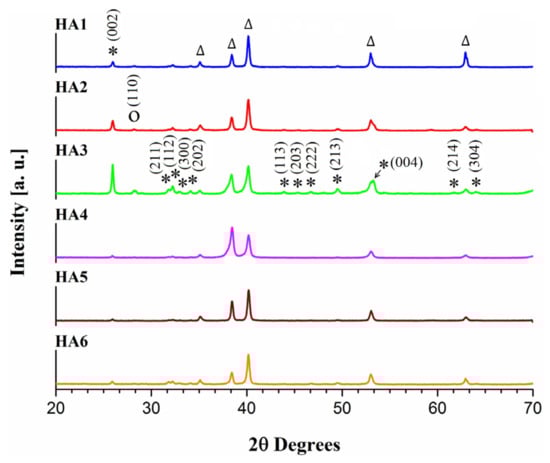 XRD patterns obtained for the HA1-HA6 samples, electrodeposited at 80 °C. The ∆ symbol indicates the diffraction peaks corresponding to the Ti support. The O symbol indicates the diffraction peak possibly corresponding to octacalcium phosphate (OCP). The peaks that belong to HA are marked with *.