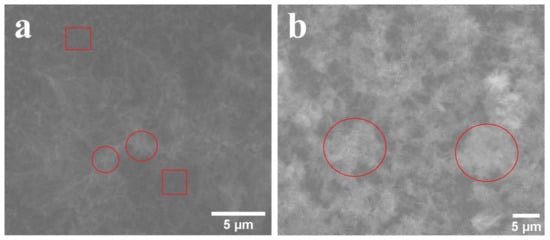 Some SEM images of the specimens obtained by deposition during 2 h at 80 °C are presented in Figure 2 (the SEM images recorded for samples resulted after 1 h and 4 h deposition times are presented in []). In the experiments performed thus far, coherence was noticed for the samples obtained by adding Ca to the electrolyte regarding the fact that HA nucleated as islands on the substrate, followed by new HA crystals covering these islands (circle marks in Figure 2a) and the substrate that was not coated by islands (square marks in Figure 2a). As the electrolyte solution was supplemented with precursor ions, new nucleation centers were created, which led to the growth of new crystals over the primary isolated formations and base layer. The crystals were submicrometric in size and acicular in shape, grown along the c direction (according to XRD). When P was added to the electrolyte, hemispherical formations of acicular HA crystals appeared from place to place, then grew with the deposition time not as much in size, but more in number (the c-direction growth was much reduced, according the XRD). The trend is that they do not cover the substrate completely, but form more of a porous structure (circle marks in Figure 2b). The assumption is that the formation of a large number of small crystals is favored by the low supersaturation of the electrolyte solution given by the experimental methodology, and the continuous addition of fresh precursor solution stimulates the formation of new nuclei.
