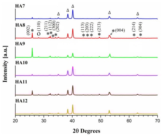 XRD patterns obtained for the HA7-HA12 samples, electrodeposited at 90 °C. The ∆ symbol indicates the diffraction peaks corresponding to the Ti support. The O symbol indicates the diffraction peak possibly corresponding to octacalcium phosphate (OCP). The peaks that belong to HA are marked with *.