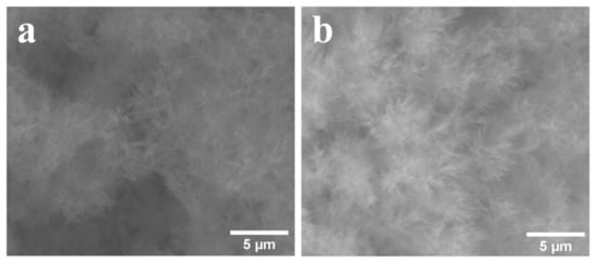As seen in the SEM images presented in Figure 4, the aspect of the deposited layer resembled glass wool for both samples. For the samples deposited for 4 h by adding P (Figure 4b), the increase in temperature from 80 to 90 °C led to the enhanced preferential growth along the c direction and formation of long (few micrometers) needle-like crystals grouped in spherically-shaped arrangements, without preserving the previous feathery aspect obtained for samples deposited at 80 °C for 4 h (see []). The XRD patterns did not display changes for the P-added samples (4 h deposition time) when the deposition temperature increased from 80 to 90 °C.